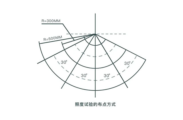 我国国标 《读写作业台灯性能要求》中对于台灯照度均匀度的要求是这样的: 以台灯灯体正下方一点为圆心, 将朝向用户这一侧120°的扇形区域划分为半径R = 300mm 和R = 500mm两个区域。每一个区域内 最大照度/最小照度 的比值小于3即符合国标AA级标准。